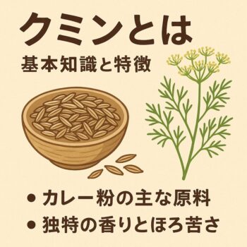 - クミンはセリ科の植物の種子を乾燥させたスパイスで独特の香りと風味が特徴