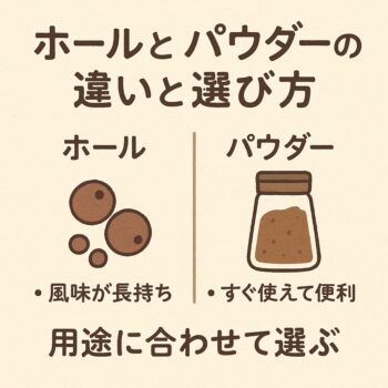 香りの強さはホールとパウダーで異なり、ホールの方が香りの持続性に優れています。パウダーは表面積が大きいため香りが立ちやすい反面、揮発も早く進むという特性があります。