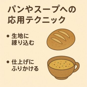 - パン生地にクミンシードを練り込むと焼き上がりに香ばしい風味が加わる