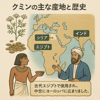 クミンは古代から人類が利用してきたスパイスの一つで、その歴史は数千年にわたります。原産地は地中海沿岸から西アジアにかけての地域とされており、現在でも中東やインド、北アフリカなどで広く栽培されています。