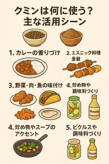 - 炒め物では調理の最初にクミンホールを油で炒めるテンパリングが基本